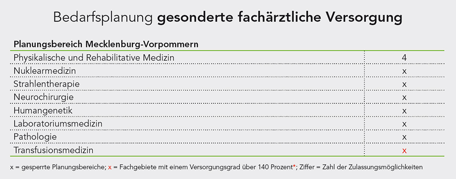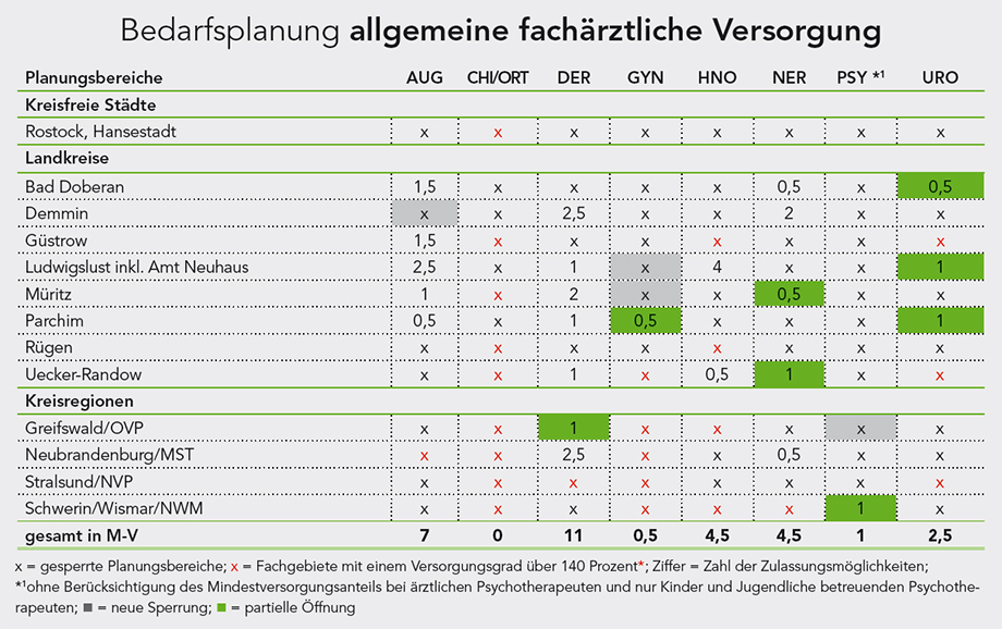 Achtung: Der Landesausschuss Ärzte und Krankenkassen M-V hat in seiner Sitzung am 10. Dezember 2025 erneut die Feststellung nach § 103 Abs. 1 SGB V bezüglich der Überschreitung des allgemeinen bedarfsgerechten Versorgungsgrads um 40 Prozentpunkte getroffen. Die betreffenden Fachgebiete und Planungsbereiche sind mit einem roten Kreuz (x) gekennzeichnet.