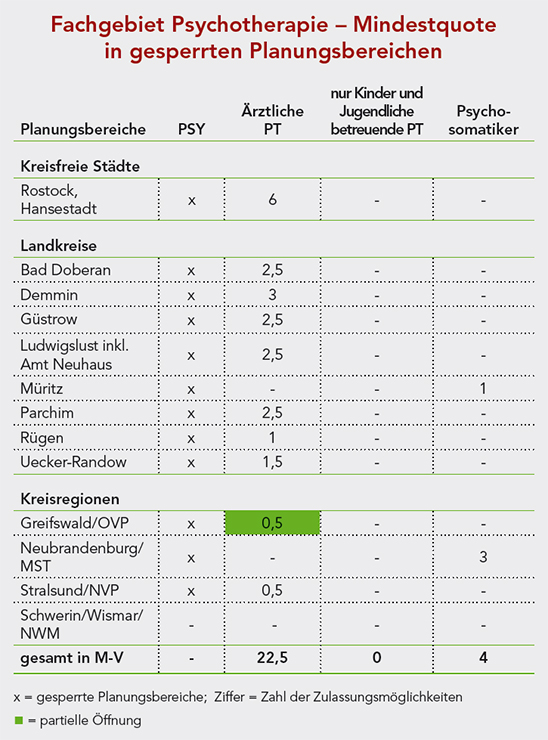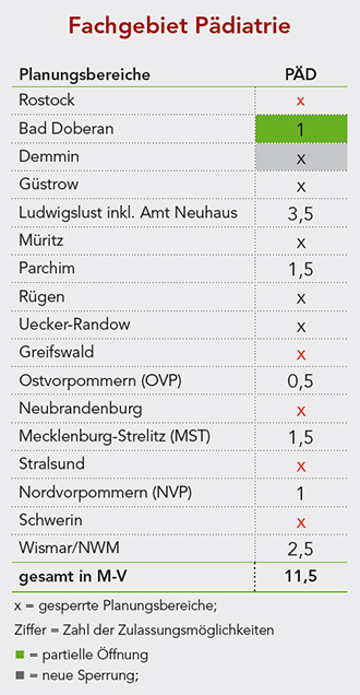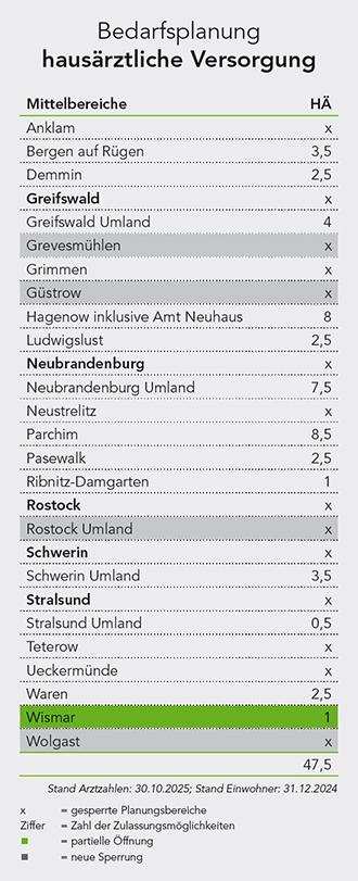 In der Sitzung des Landesausschusses der Ärzte und Krankenkassen M-V wurde auf der Grundlage des zwischen den Krankenkassen und der KVMV gemäß § 99 Abs. 1 SGB V einvernehmlich erstellten Bedarfsplanes sowie in Anwendung der Bedarfsplanungs-Richtlinie des Gemeinsamen Bundesausschusses in der Neufassung vom 20. Dezember 2012, zuletzt geändert am 18. Juni 2025, über die Anordnung und Aufhebung von Zulassungsbeschränkungen beschlossen.